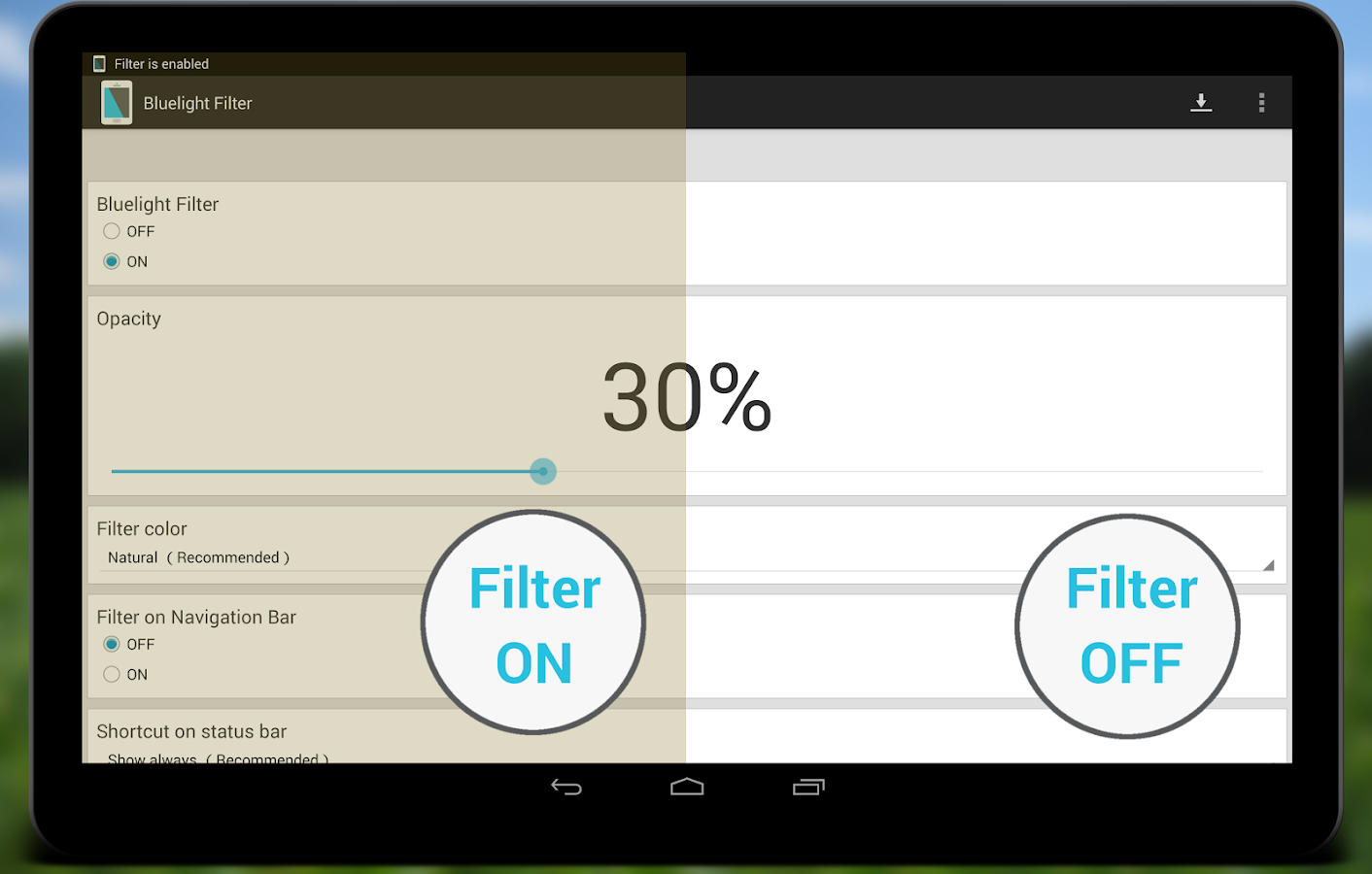 Bluelight Filter http://i.myegy.to/images/1cd0107f39e4.original.png http://store2.up-00.com/2015-01/1422301265051.png Descriiption Avoid Eye Strain Bluelight from your smartphone or tablet causes strain on your eyes and keeps you from falling asleep at night. This app adjusts your screen color to reduce the blue light and helps your eyes to relax, making it easier for you to fall asleep. Features Free Screen Filter App to Protect Your Eyes You can reduce the strain on your eyes easily. Its simple but effective! All you have to do is launch this app. Screen Filter with Natural Color This apps filter has a natural color so you can read news, emails and websites clearly. This app doesnt dim the screen but adjusts the screen color to reduce blue light which causes strain on your eyes. Easy Operation Its easy to turn on or off with just one tap. You can adjust the opacity of the filter. Choose between 5 different filter colors. Turn On or Off Quickly and Easily You can choose to show or hide a filter icon in the status bar, making it easy to tweak the settings at any time. Startup Automatically You can choose whether or not the filter launches on startup. Eye Care in your Smartphone or Tablet This app works on most smartphones such as Samsung Galaxy, HTC ONE Xperia and so on. It also works on tablets such as Nexus 7, Nexus 10, ASUS MeMO Pad, Acer ICONIA and more! Additional information UpdatedDecember 20, 2014 Size 1.4M Installs 5,000,000 - 10,000,000 Current Version 1.89 Requires Android 2.3 and up https://lh3.ggpht.com/uxMgVeczyrCukU...BaC5Ndjz4=h900 http://imagizer.imageshack.com/img537/3062/tsOxwu.png Mediafire |